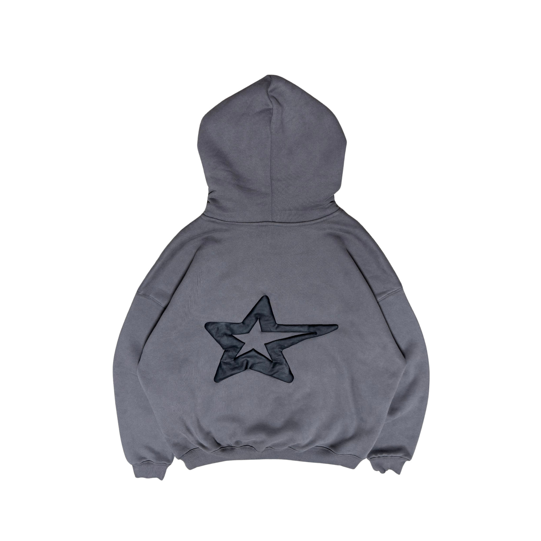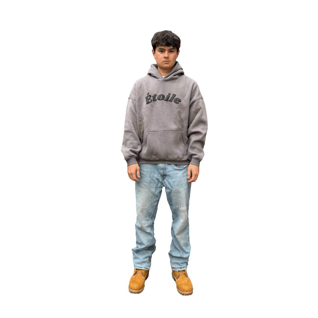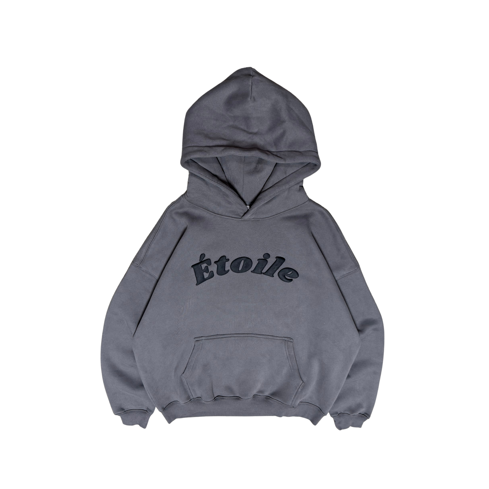 A neutral gray hoodie with raised puff print Étoile branding and a statement star on the back. Modern, versatile, and built for everyday wear streetwear you can elevate with ease.